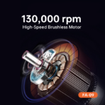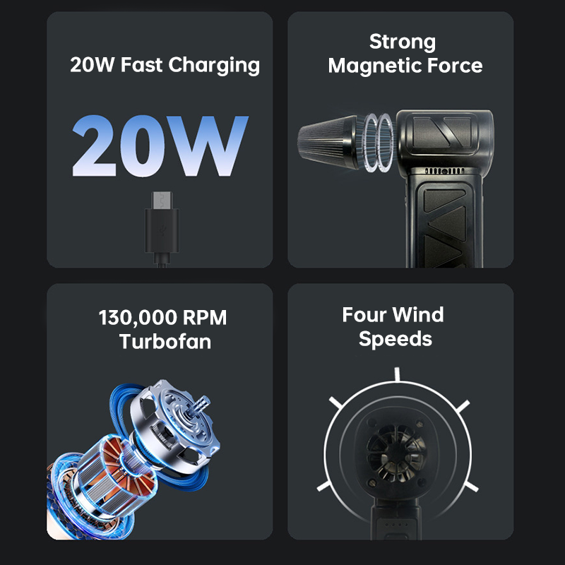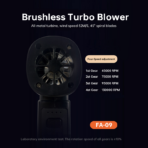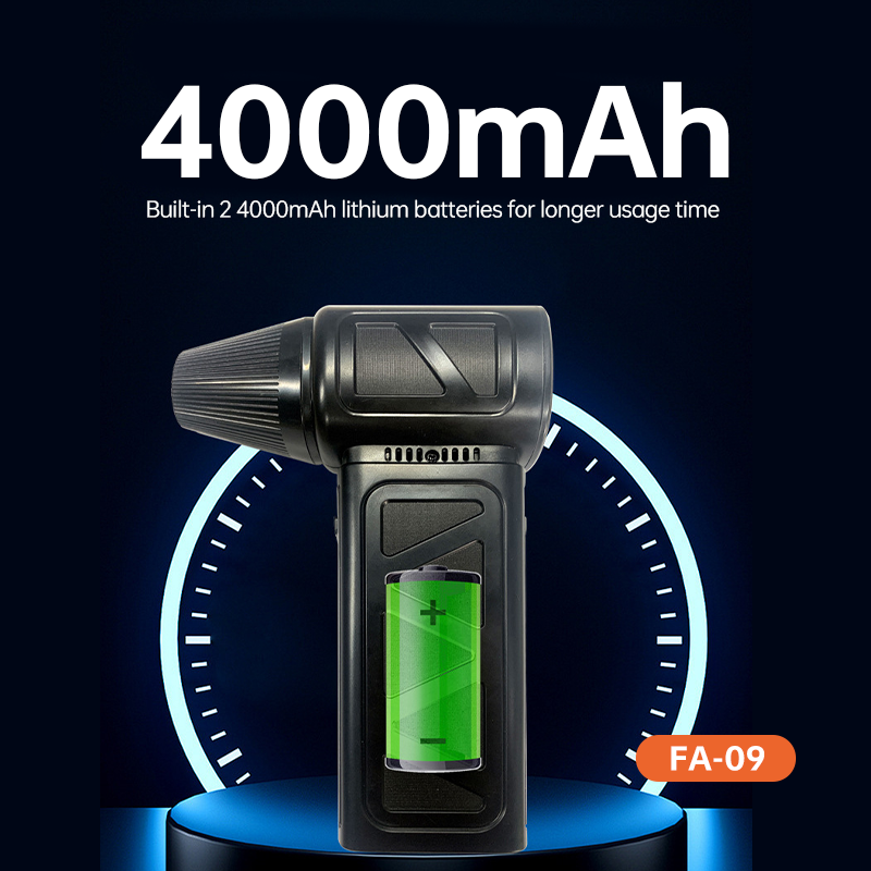 Battery:4000mAh*2Voltage:5V/2APower:160WWind speed:1st gear 25m/s, 2nd gear 32m/s, 3rd gear 40m/s,4th gear 50m/s, violent gear 60m/s,Rotation speed:1st gear 78800 rpm,2nd gear 93900 rpm, 3rd gear 99000 rpm,4th gear 103000 rpm, violent gear 130000 rpmWind pressure: 1st gear 17g,2nd gear 40g, 3rd gear 60g,4th gear 110g, violent gear 200gCharging method:Type-c